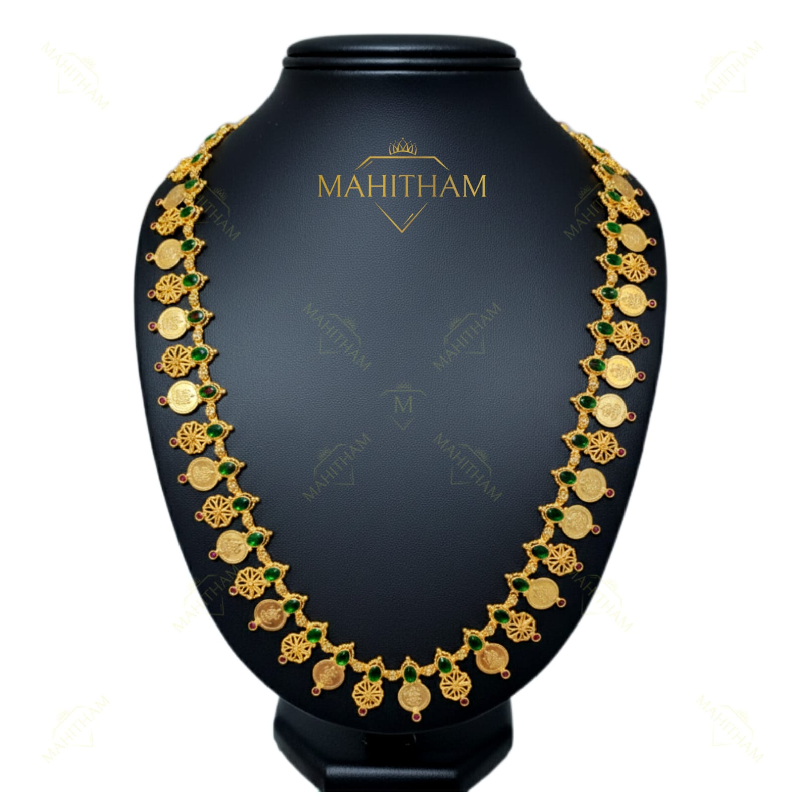 The Mahitham Green AD Lakshmi Coin Haram (MG-2173) is a classic long traditional necklace inspired by South Indian temple jewellery. This elegant haram features a beautiful alternating pattern of Lakshmi coins and intricately crafted floral motifs, creating a rich and balanced design throughout the length of the necklace.